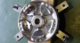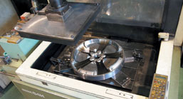 Milling Before the electrical discharge machining stage, a high-speed machining center is used to perform rough milling of the work piece. In the past we used to employ electrical discharge machining for the entire milling process, but adding this extra stage actually ends up shortening the total amount of time required. In addition, it can be performed simultaneously with electrode fabrication, so the work can be mounted in the electrical discharge machine immediately after rough milling is finished. This eliminates machine idle time and helps ensure that machining proceeds efficiently and according to schedule. At Morikawa Kanagata we take great care when acquiring new equipment to ensure a well- balanced lineup of machine tools so that the work process can progress smoothly. |