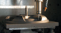processing difficult-to- mill materials for which high-speed machining centers optimized for high- precision milling are not suitable. Work that cannot be milled using a machining center includes materials that are even harder than the cutting tool, difficult-to- mill materials, and narrow or deep cavities. For these, electrical discharge machining is the solution. First, a high-speed graphite electrode machine is used to fabricate the male electrodes from graphite, which is easy to mill. These are then used in an electrical discharge machine to make the molds and female dies. For example, it is not possible to mill an object with deep, narrow grooves using a machining center, but it is possible to mill a male die that is the inverted configuration of the object. Once one has a male electrode, an electrical discharge machine can be used to mill the desired mold. In this way, a high- speed graphite electrode machine and an electrical discharge machine can be used in tandem to fabricate molds with difficult-to-mill configurations. In addition, the use of high-precision automated machine tools makes continuous unattended operation possible. This contributes to shorter delivery times and reduced cost. For products where the cosmetic design is an important consideration, and where there is a need to check the final form against a design model, a prototype can be fabricated in graphite. This makes it possible to confirm the final form of the product and to produce a mold that matches the design model precisely. Once the final confirmation is complete, an electrical discharge machine is employed to fabricate the mold, using an electrode made of graphite. |