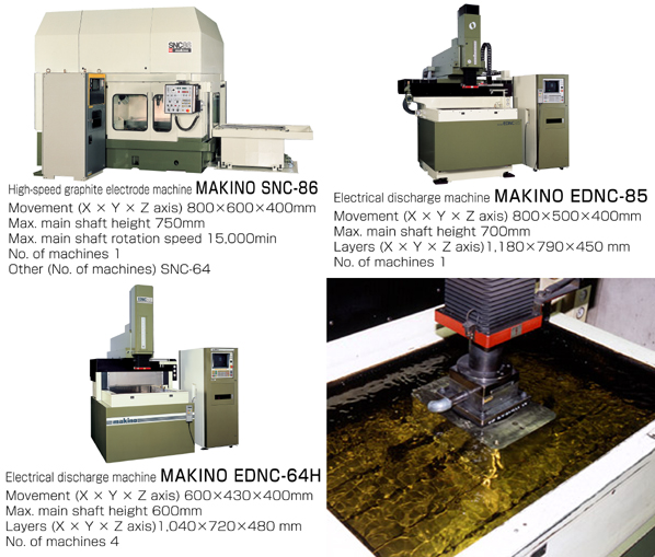 excellent precision and automated operation Makino EDNC series machine tools provide state-of-the-art performance in terms of both ease of operation and automation, making them indispensable for mold production. Their biggest features are an automation system combining an Auto Work Changer* (AWC), an Auto Tool Changer* (ATC), and the New Expert System*. The latterfs P Pulse milling status optimization function uses numerical control to precisely monitor spark discharge, a job that was previously performed by a skilled human operator. Stable and optimal machining is made possible by the A Jump function, which controls jump operation, and S Control, which eliminates instability immediately after milling starts. The Smokeless* (SL) system, which uses suction to remove smoke and chips, is particularly effective when milling large work pieces. Additional features include the Multi Application* (MA) head, which rotates to introduce a series of electrodes, and Mini CIM*, which supports the operation of multiple machine tools from a single personal computer. These features combine to provide superior functionality, reliability, and ease of operation, making Makinofs electrical discharge machines the best currently available. Such top-class machine tools make it possible for us to manufacture a wide variety of molds reliably and to provide service our clients can depend on. * Product data provided by Makino Milling Machine Co., Ltd. |
