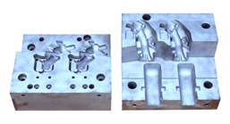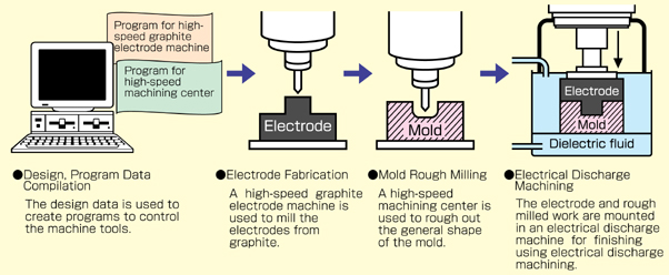 Discharge Machining The electrode fabricated using a high-speed graphite electrode machine and the rough milled work piece are mounted in an electrical discharge machine. Electrical discharge machining then takes place, guided by program data input to the electrical discharge machine. This process produces results that are highly precise and accurate. Since it is automated, it can proceed day and night, 24 hours a day. |