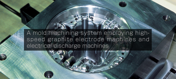 Fabrication Program data designed using CAD/CAM is input to a high-speed graphite electrode machine, which mills the electrodes. Electrical discharge machining is then employed to make the molds, using the graphite electrodes as the basis. Graphite is used because it is easy to mill, requiring approximately one-fourth the time needed to mill copper, for example. Using this ideal electrode material reduces the overall machining time and increases milling precision. |